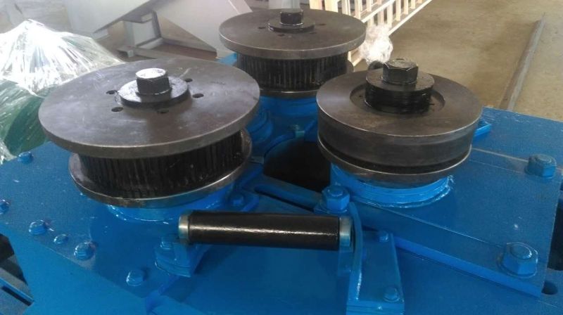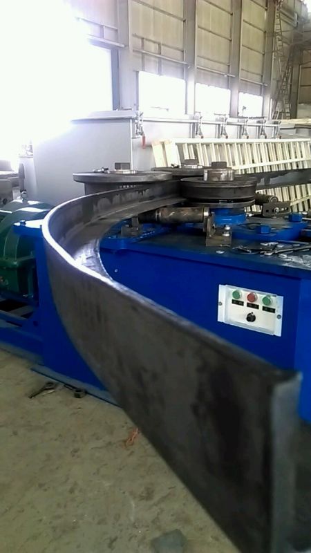 F6型卷圓機(jī)是對稱式三輥型材卷圓機(jī),集機(jī)電一體,將電動機(jī)輸出的較高轉(zhuǎn)速通過傳動裝置、聯(lián)軸器、減速機(jī)、齒輪等轉(zhuǎn)換為所需的大轉(zhuǎn)矩低轉(zhuǎn)速,帶動位置固定的兩主動輥實現(xiàn)旋轉(zhuǎn)運(yùn)動,為型材行走提供扭矩。被動輥通過手輪前進(jìn)、后退實現(xiàn)位移,為卷制型材提供所需的加壓力,位移量由數(shù)字標(biāo)尺實時顯示。三個工作輥成等腰三角形分布,通過移動被動輥位置實現(xiàn)這三個點形成的弧線達(dá)到所需彎曲半徑,即調(diào)整所彎型材的曲率。借助被動輥的壓緊及兩主動輥的旋轉(zhuǎn)運(yùn)動,使型材經(jīng)過多道次連續(xù)彎曲,產(chǎn)生永久性的塑性變形,用于常溫狀態(tài)下將型材卷制成圓形、弧形、螺旋形等工件。372378308934599585